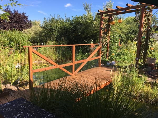 Gartenteich mit Holzbrücke, Zugang zum Garten