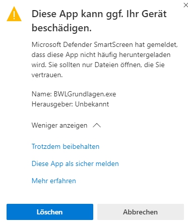 Klicken Sie auf 'Trotzdem beibehalten'. Danach erfolgt der Download Klicken Sie im Download-Verzeichnis auf die Datei und danach auf 'Weitere Informationen'.