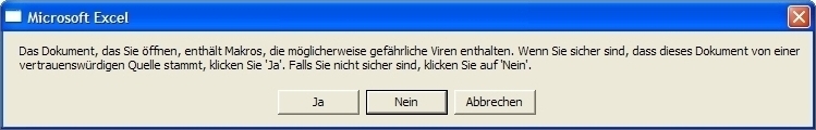 Die Excel-Anwendungen sind mit Hilfe der Makro- und VBA-Programmierung unter Excel erstellt. Beantworten Sie die Makrowarnung von Excel mit "JA" um die Anwendungen uneingeschränkt nutzen zu können. Wenn Sie die Makrowarung mit "NEIN" beantworten, startet Excel im "Entwurfsmodus" bei deaktivierten Makros.